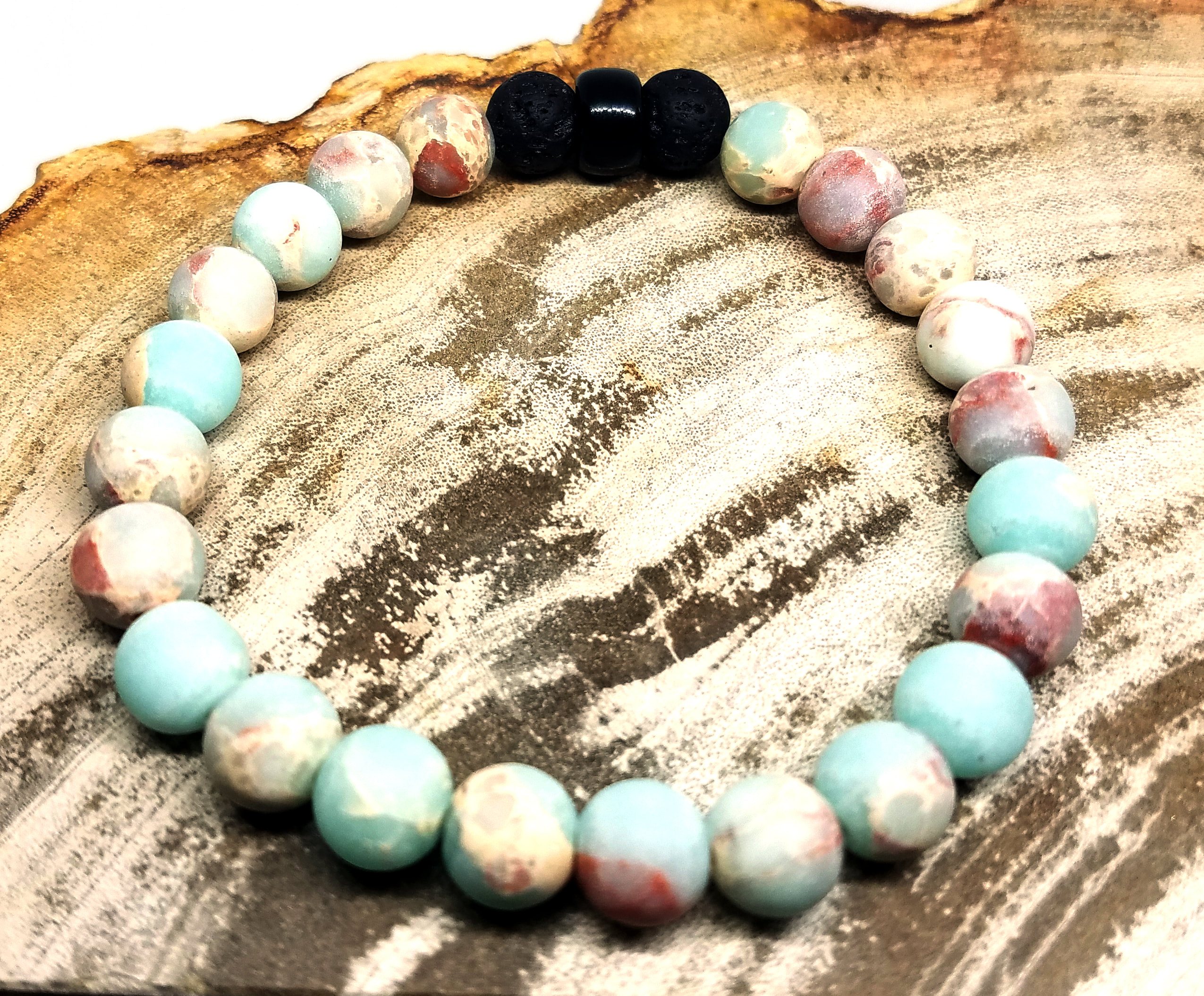 Powder Blue Jasper marbled with earth tone hues paired with basalt to diffuse essential oils.