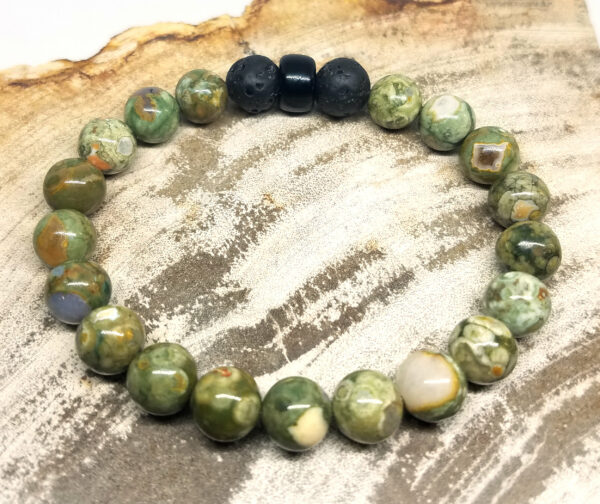 Beautiful green marbled colored rainforest jasper stone that is paired with basalt to diffuse essential oils.